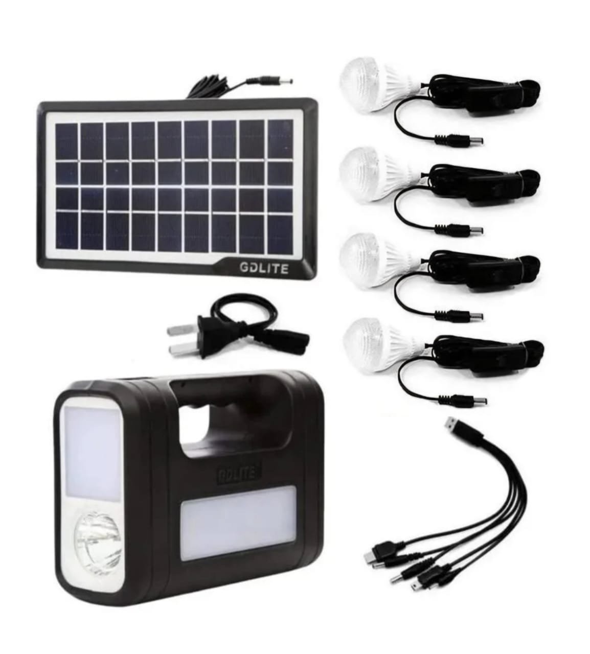 PANEL KIT SOLAR GDLITE 4 BOMBILLOS • Sistema de iluminación, 4 bombillos y lampara en la parte frontal y lateral • Sirve para conectar los teléfonos móviles • Sirve para dos fuentes de energía de adaptador o panel solar • Tiempo de carga aproximadamente 10- 12horas • Panel solar 9v / 3-7w.